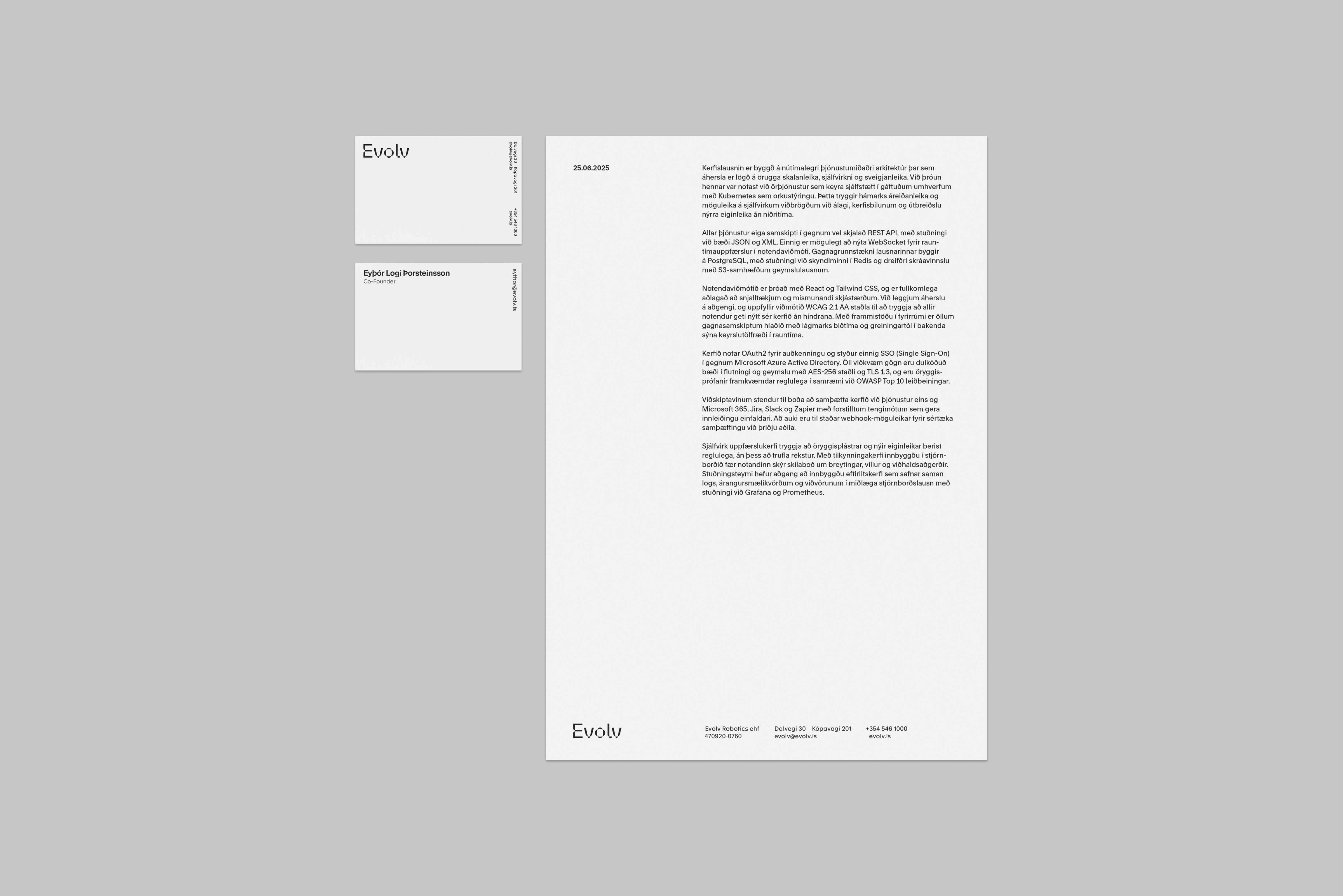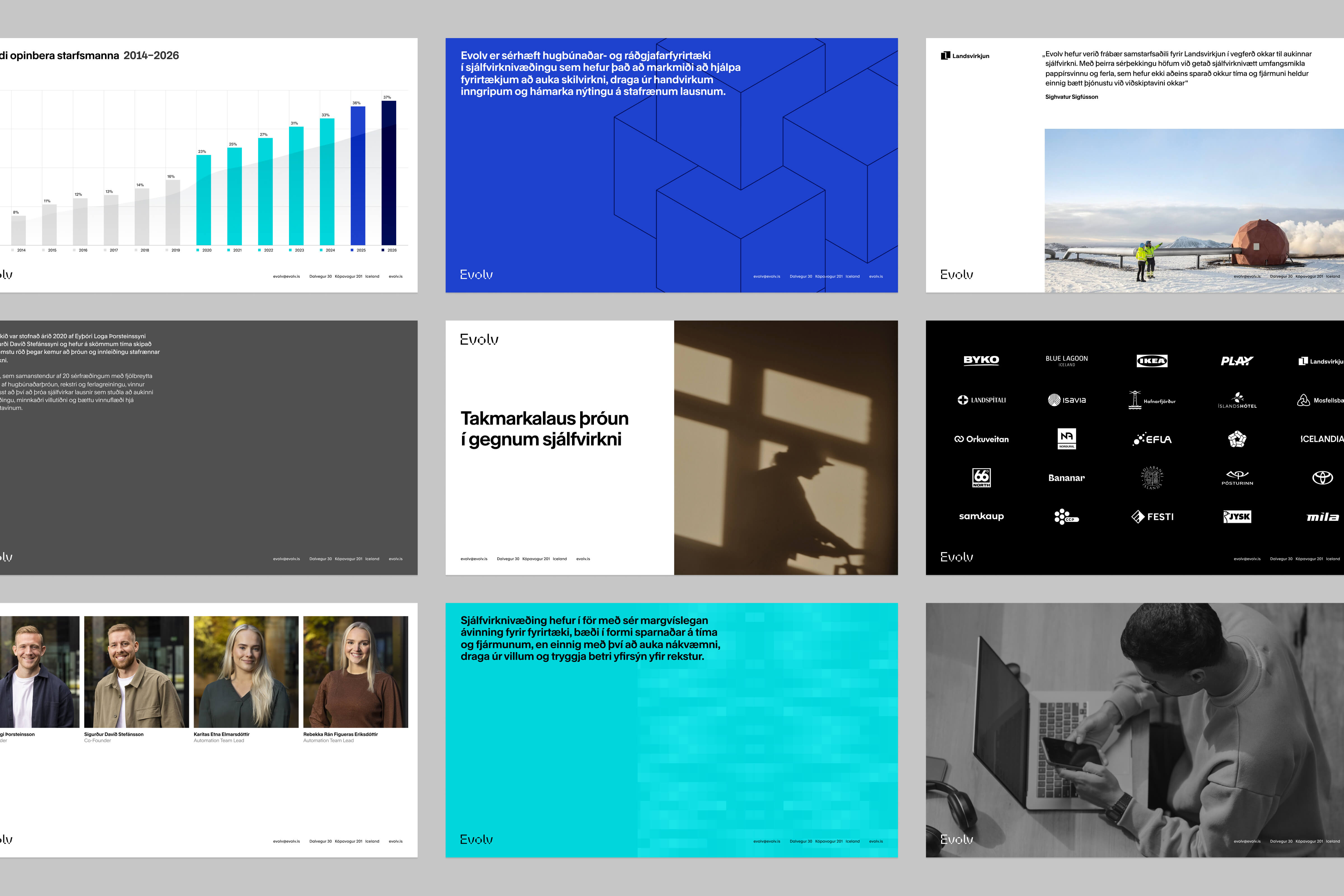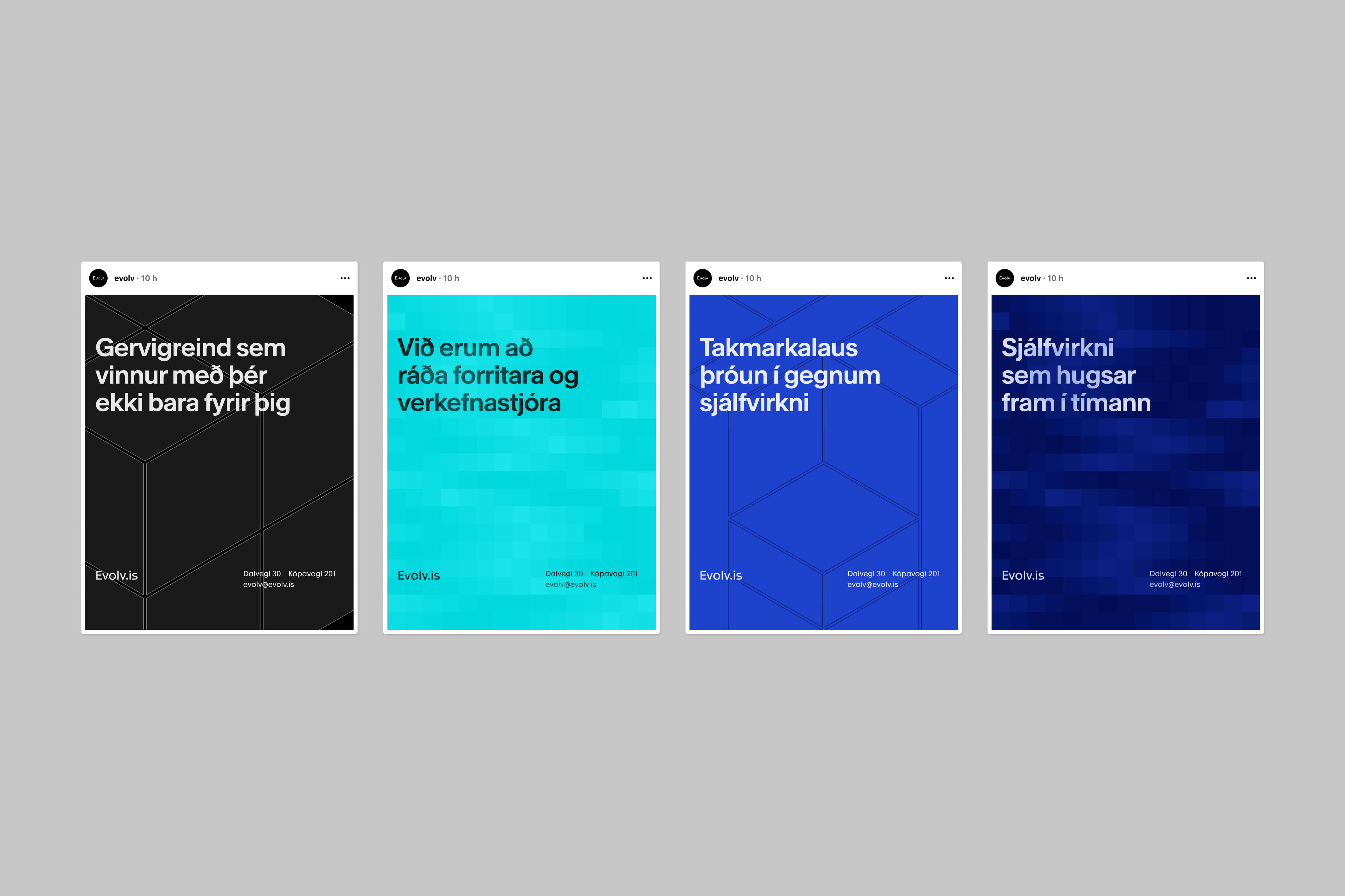 Visual identity for Evolv, designed to reflect their focus on intelligent automation. Evolv is a Reykjavík-based software company made up of specialists in technology, operations, and process design. They create solutions that simplify complex workflows in line with business strategy.